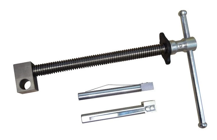 Effectuez des serrages fluides et puissants grâce à la grande vis (tige acier laminé à filetage trapézoïdale Ø 24 mm, pas de 5 mm) de ??? mm et au levier en acier.