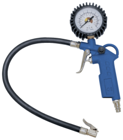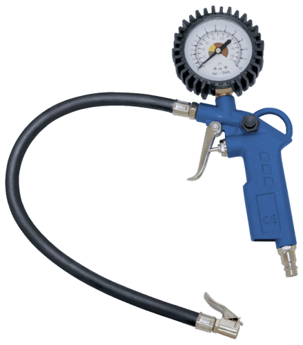 - Un pistolet de gonflage avec un manomètre à affichage en bar/psi, protégé par une coque en caoutchouc et équipé d’un bouton de dégonflage